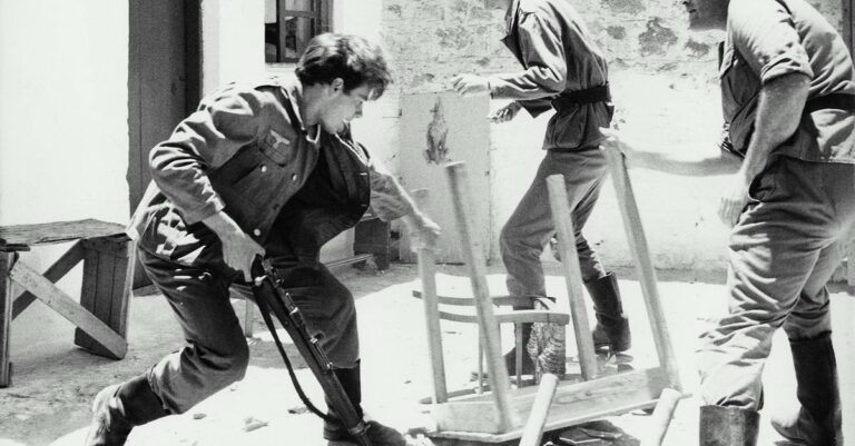 Il y emménage avec sa femme grecque épousée depuis peu ainsi que deux soldats, Meinhard et Becker. Très vite, le petit groupe trouve ses marques mais le temps se fait long et à part repeindre les portes et piéger, pour les attraper, les blattes qui envahissent les lieux, il n’y a pas grand-chose à faire. Le lieu pourtant y a laissé quelques traces historiques telle une inscription rédigée en grec ancien et que Becker, qui a une formation de philologue, va tenter de traduire en vain : le château garde ses mystères. Et également ces pierres, vieilles de deux millénaires. Nous sommes transportés dans le temps et dans un no man’s land où l’Histoire semble s’être arrêtée. On apprend par la voix off que c’est une des rares villes de la région à n’avoir point été bombardée. Comme si le monde extérieur avait décidé de l’ignorer. Quelques plans pourtant nous mettent en contact avec la population : assis à la terrasse d’un café, Meinhard et Stroszek bavardent ensemble interpellés par un tzigane étrange qui dit être le roi d’une tribu dont il a perdu la trace. Lui aussi est donc un étranger perdu au milieu de cette guerre. Et puis il y a les enfants du port avec lesquels Stroszek tente dans une langue maladroite d’échanger.